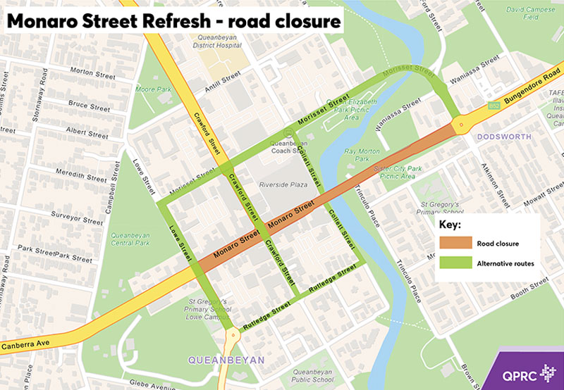 Please note, Monaro Street will be closed from the Atkinson Street roundabout to Lowe Street for a minimum of 6 months for construction.